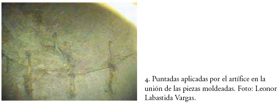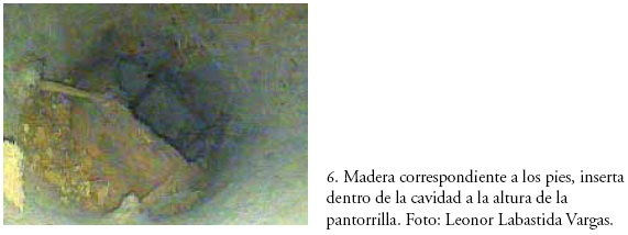 El análisis con el videoscopio permitió observar la parte inferior de las extremidades, en donde se aprecia la unión de los pies tallados en lo que también parece ser madera de colorín, incrustados de la misma manera que la cabeza sobre los hombros (fig. 6). Nuevamente aparecen los respectivos encolados, las correspondientes costuras de unión y la aplicación de afiladas astillas que refuerzan el anclaje. Conviene destacar la introducción, en una de las piernas, de un perno de madera dura que llega hasta media pantorrilla y cuyo cometido no pudo determinarse con certeza. Es posible que sirviera de cuña y anclaje en la fijación y realización de la extremidad.