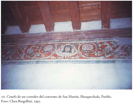 Un elemento en particular de la decoración de Cuevas confirma esta conclusión. Hay que notar que los motivos de las flores, hojas y guías rebasan el entablado para correr también por toda la cenefa pintada en la pared inmediatamente debajo del cielo de la nave. Se trata de un solo motivo repetido muchas veces: una guía, en forma de S alargada, de hojas y flores estilizadas, que se extiende simétricamente a ambos lados de una cabecilla de angelito enmarcada por dos aves (fig. 7). Se trata de esquematizaciones de formas naturales dentro de un diseño regular y de un realismo delicado aunque repetitivo en la representación de los angelitos y de las aves. La pintura de la cenefa se trata aquí de las paredes, ya no del entablado propiamente es de buena calidad, como puede verse en la sutileza del colorido yen las variaciones en las cabecillas. Este esquema, de un elemento sagrado al centro y guías a los lados, está presente no sólo en Santa María, sino también en muchísimos metros de cenefas pintadas en conventos e iglesias novohispanas del siglo XVI. Hay casos parecidos a la cenefa de Santa María en los fragmentos recién encontrados en Tlatelolco26 y en el convento franciscano de Huaquechula, por ejemplo (fig. 10). En algunas cenefas del siglo XVI se ven las mismas guías en forma de cornucopias que podemos observar en Cuevas, las aves simétricas y las cabecillas de angelitos. Hay que subrayar que en Santa María ha desaparecido cualquier rasgo grutesco del tipo que está presente en Serlio y en algunos conventos; vemos más bien motivos renacentistas depurados y cristianizados, como es de esperar en obras posteriores al Concilio de Trento.