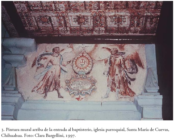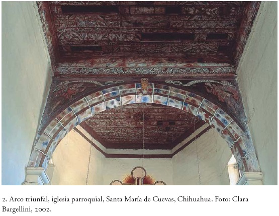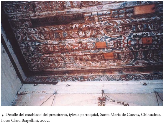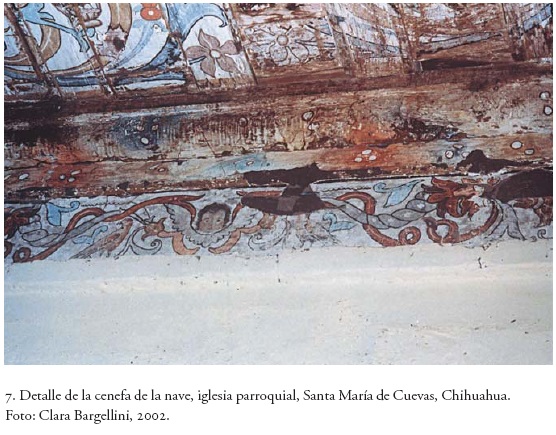 The church of Santa María de Cuevas, once part of a Jesuit mission in the Baja Tarahumara region, was completed in 1700. An important element of its interior decoration is a painted entablado, or boarded ceiling, the only one of its kind conserved in Mexico. A review of the history of the church situates it within that of the architecture of the region in a period of growth and architectural ambitions shared by both Jesuits and settlers. Although the loss of material evidence and the absence of previous studies make it difficult to reach convincing results regarding the precise identification of the ceiling's structural typology, certain iconographic features relate it to traditions of architectural decoration that reached New Spain in the sixteenth century and then spread to the marginal regions of the Viceroyalty where their remains are still to be found. At the same time an examination of the decoration of the church of Santa María as a whole reveals the possible existence of an iconographic program taking in the entire building, both interior and façade.
