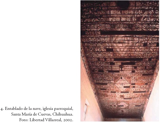 En un primer momento, la existencia de un gran número de artesones de madera pintados en Michoacán15 me llevó a pensar que pudo haber una relación estrecha entre estas obras y la de Santa María. Se tienen, además, numerosas noticias de presencia michoacana en la población del centro-norte, así como de nexos comerciales.16 A pesar de todas estas relaciones, el estudio y la observación más cuidadosa de algunos casos aconsejan reformular esta hipótesis, porque los artesones pintados que hoy se conservan en Michoacán no son parte integral de las techumbres como en Santa María. Más aún, el entablado de Cuevas es más antiguo que prácticamente todos los techos michoacanos que se conservan. Por lo pronto, y reconociendo la necesidad de ulteriores estudios tanto en Michoacán como en Chihuahua, podemos seguir pensando que los techos michoacanos son importantes para Santa María, como referencia y comparación, pero no necesariamente como origen directo de una tradición artesanal.17 Más bien, el origen de lo que se hizo tanto en la Tarahumara como en Michoacán estaría en una tradición aún más antigua.