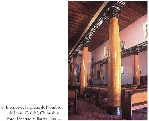 Ha desaparecido la pintura original en su interior, pero la iglesia de Carichí con sus columnas de troncos de pino existe todavía (fig. 6). Parece que De los Santos y probablemente algunos maestros u oficiales que trabajaban con él utilizaron en Carichí algunos de los mismos recursos de carpintería y pintura que vemos en Cuevas y en otras misiones. Hay que concluir que la construcción de Santa María de Cuevas, probablemente llevada a cabo entre 1678 y 1692, pese a tener un tipo relativamente sencillo en su estructura fundamental, se inserta en una historia de ambiciones arquitectónicas de los jesuitas en la región hacia finales del siglo XVII. En Cuevas estos anhelos se concentraron en el adorno del templo de la misión, emprendido en los años posteriores a su construcción.