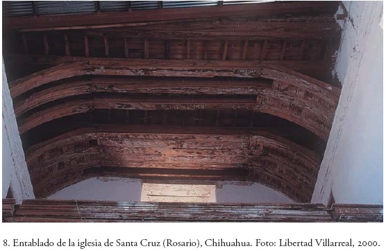 A pesar de que el techo de Santa María es el ejemplo más antiguo que conozco hasta el momento en México con su particular forma de construcción y decoración, no cabe de ninguna manera afirmar que haya sido ni el primero ni el único. En el siglo XVII hubo en toda la Nueva España un proceso general de sustitución de techos de madera por cubiertas de bóveda, y en el siglo XX la sustitución de techos de vigas por cemento o estructuras metálicas con aluminio ha sido desastrosa para la historia de la arquitectura. Los techos de madera son muy pocos con relación a los que hubo, y están muy alterados en muchos casos, así que hemos perdido una gran cantidad de obras que podrían haber sido los antecedentes directos del techo pintado de Santa María. Por lo pronto, sin embargo, los únicos techos con este sistema de construcción que conozco en México están en la Baja Tarahumara, en las iglesias de las exmisiones jesuitas de Cuevas y en la sección central de la nave de Santa Cruz (hoy Rosario) (fig. 8). Es posible que el techo "curiosamente pintado" de Carichí haya sido del mismo tipo. Estos techos y los otros que están mencionados en documentos, o que se conservan muy parcialmente,18 confirman la importancia del entablado de Santa María, aunque no ayudan a rastrear sus orígenes en otras regiones.