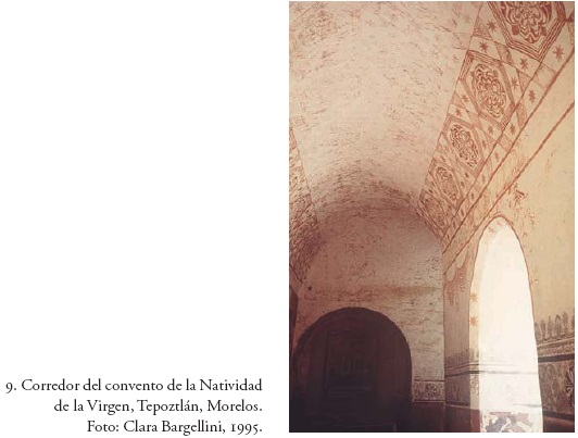 Mientras tanto, sin embargo, podemos avanzar por otro camino: el del diseño de la decoración del entablado de Santa María. Se pueden agrupar en tres tipos las distintas maneras en que se relacionaron los diseños de las cubiertas con la arquitectura en la Nueva España. Uno es el diseño que repite el mismo motivo, sin poner atención particular en la forma o dimensión del espacio a cubrir. Por lo general, los diseños de estos techos son geométricos y derivan de modelos del tratado de arquitectura del siglo XVI de Sebastián Serlio. La definición del espacio se da generalmente por elementos que enmarcan y, por lo tanto, delimitan y contienen los motivos repetitivos de la decoración del techo. Fue muy frecuente este tipo de decoración en los espacios conventuales del siglo XVI (fig. 9).