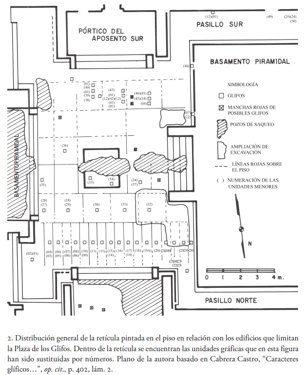 Como se puede analizar en la lámina anterior, una retícula pintada sobre el piso del patio determina la distribución de las unidades visuales discretas o glifos. La retícula está constituida por líneas rectas que forman un tejido de trazos paralelos y perpendiculares orientados de manera congruente con las edificaciones situadas alrededor de la plaza; además del elemento antes mencionado, los componentes que conforman las pinturas del patio son unidades relacionadas visualmente con otras en la misma composición, ya sea en secuencias, conjuntos y elementos dentro de la retícula que no conforman secuencias ni conjuntos, o elementos fuera de la retícula.