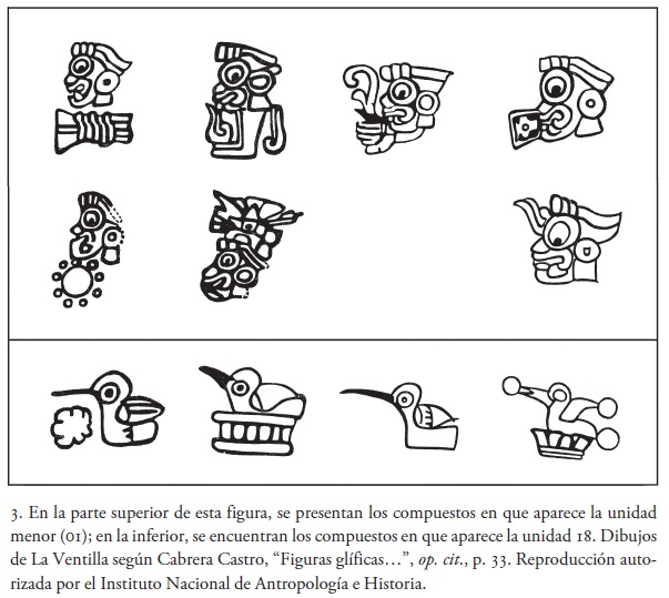 19. Joyce Marcus, op. cit., p. 168 (la traducción es mía). "In Nahuatl, the qualifier precedes the noun, so that 'Hill of the Bird' is Tototepec (tototl = bird + tepetl = hill) and 'Hill of the Jaguar' is Ocelotepec (ocelotl + tepetl). In Mixtec and Zapotec, the qualifier follows the noun. Thus, 'Hill of the Bird' in mixtec would be Yucu Dzaa, from yucu (hill) + dzaa (bird); 'Hill of the Jaguar' in Zapotec would be Tani Guebeche, from tani (hill) + guebeche (fierce carnivore). In all three hieroglyphic writing systems, however, the specifying element (e.g., 'bird', 'jaguar') is shown above the hill sign, indicating a convention that makes the word order of the spoken language irrelevant in some cases".