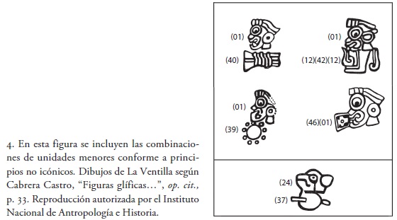 Respecto a las relaciones observadas entre componentes de unidades mayores, algunas llegan a incluir elementos figurativos conforme a principios combinatorios convencionales y no icónicos; tal sería el caso del compuesto marcado con los números 24-37, y tal vez puede decirse lo mismo de los compuestos 01-40, 01-39, 01-12-42-12 y 46-01, a menos, desde luego, que combinaciones como éstas constituyan reducciones metonímicas expresadas, por ejemplo, por medio de logogramas (véase fig. 4).