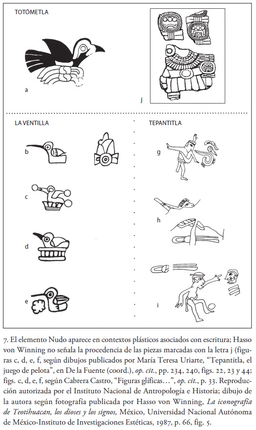 32. Los detalles de esta clasificación se pueden consultar en Lombardo, op. cit., pp. 28-35. Acerca de la imagen pintada en un fragmento del mural procedente de Tepantitla, Taube opina lo siguiente: "una persona bate sus brazos mientras su pierna izquierda se encuentra fuertemente atada a su pecho. La voluta del habla que la acompaña lleva un nudo y una cabeza de ave, un texto que probablemente se refiere al juego 'pájaro atado'." Karl Taube, "The Writing System of Ancient Teotihuacan", Ancient America, Carolina del Norte/Washington, Barnardsville/Center for American Studies, 2000, vol. 1, p. 31.