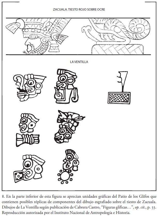 La pieza se obtuvo durante las exploraciones dirigidas por Séjourné entre 1955 y 1958. Muestra una composición gráfica que incluye el perfil de una cabeza antropomorfa provista de un tocado y, en seguida, en una secuencia horizontal alterna, por una cabeza ofidia sobrepuesta a una estera. Tal diseño se realizó posiblemente mediante unidades estandarizadas que interactúan de manera no icónica. Me permito sugerir lo anterior por varias razones: Langley registró en su catálogo algunos signos con la configuración del perfil de cabezas ofidias: 120 "Head Serpent", Reference 797 y Reference 796, además de una estera: 133 "Mat", Reference 8, y algunos perfiles de cabezas antropomorfas con distintas características. Estas configuraciones informan de la estandarización de las unidades gráficas presentes en el tiesto de Zacuala; sin embargo, considero que, en el caso teotihuacano, la estandarizada configuración de los componentes, por sí misma, no define la pertenencia a una clase compositiva determinada y, por esta razón, resulta necesario aportar mayores datos y subrayar que la imagen del tiesto puede incluir una réplica de la unidad 09 del Patio de los Glifos, interpretada como una estera. Se considera que esta última traba relaciones no icónicas con otras unidades distribuidas secuencialmente, de manera semejante a lo que puede observarse en distintos fragmentos de vasijas cerámicas teotihuacanas cuyas composiciones exhiben perfiles de cabezas ofidias, en ocasiones sobrepuestos a esteras, alternados con otros de cabezas humanas y varios elementos más.37 También se considera la presencia de unidades visuales con la configuración de cabezas antropomorfas de perfil que portan un tocado y de otras con forma de esteras, en contextos compositivos considerados no icónicos o mixtos, tanto en el Patio de los Glifos como en la serie de murales denominados "Árboles floridos de Techinantitla" y estudiados por Pasztory y otros autores, y en algunos fragmentos de pintura mural estudiados por Millon (véase fig. 8).38