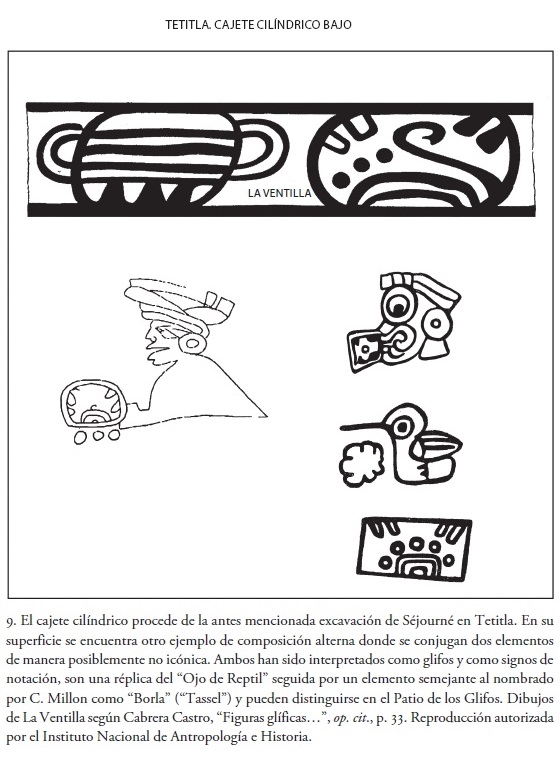 La pieza se halló durante las exploraciones de Séjourné realizadas en este lugar. Como se vio, varios ejemplos de composiciones con elementos alternos distribuidos de manera horizontal en soportes cerámicos muestran, con frecuencia, componentes interpretados como glifos por diversos autores. En el caso de la imagen que se estudiará a continuación, se trata de un recipiente donde se alternan el "Ojo de Reptil" (similar a L165 "RE", Reference 151) y la "Borla" (similar a L206 "Tassel", Reference 37 y 589) o un elemento parecido a L "Tuft", Reference 184 y 232, de forma semejante a la señalada por Millon en cuanto a "Tuft", parte del compuesto glífico "Señor Coyote" interpretado como la versión abreviada de un tocado47 y pintado sobre un fragmento de muro procedente de Techinantitla. Por motivos que ya se expusieron, tal vez hay réplicas de los signos "Ojo de Reptil" y "Borla" entre las unidades 44 y 22 del Patio de los Glifos, lo cual señalaría que se trata de signos estereotipados presentes en varios procesos compositivos de la misma clase (véase fig. 9).