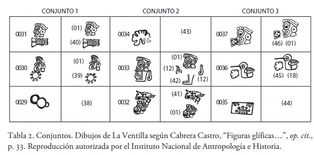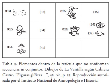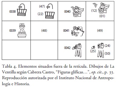En las siguientes tablas se presentan las unidades gráficas que corresponden a esta clasificación. En cada una de aquéllas, a la izquierda de los glifos, se encuentra una numeración basada en la distribución de las unidades visuales discretas en el piso de la plaza. Dicha numeración tiene por base la publicada por Cabrera en 19969 y se modificó y adaptó para los propósitos del presente trabajo: cada número se encuentra precedido por dos ceros, con el propósito de distinguirlo de la numeración de la división en unidades menores, la cual aparece entre paréntesis. A la derecha de los glifos se encuentra una propuesta de segmentación de los compuestos en unidades visuales menores, basada en la repetición de elementos dentro de la composición (véanse tablas 1-4(2,3)).10