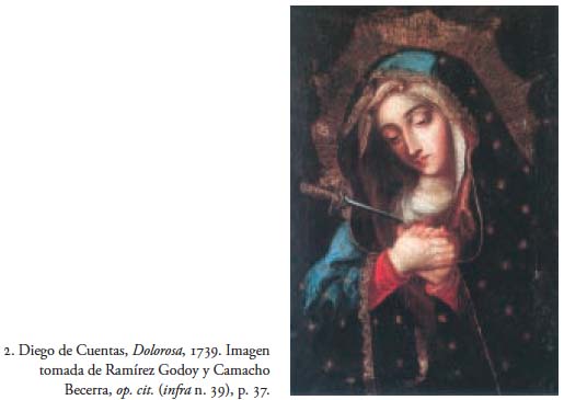 Volviendo al tema de la familia Cuentas, el documento arroja luz también sobre la estima en que se tenía a Diego de Cuentas y Alencaster en su tiempo.32 En uno de los testimonios que Francisco de Cuentas ofrece en su favor, argumenta que su abuelo pagó con una pintura el pleito por bigamia que hubo de enfrentar Diego de Cuentas Patiño. Dicha obra seguramente valía más de lo que el testigo, el licenciado don Blas de Escobedo, afirma, porque "naturalmente era preciso en el difunto el esmero en la pintura a fin de mostrarse agradecido, sin que dé la menor duda de que fuese obra prolija cuando era de los primeros pinceles de esta ciudad ".33