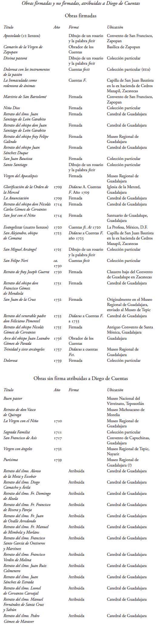 7. Toussaint, Moyssén, Orendáin y últimamente Tovar y de Teresa, Ramírez Godoy y Vidaurre han hecho referencia a los cuadros localizados en Jalisco, Zacatecas, la ciudad de México y Michoacán. Carmen Vidaurre, por su parte, realizó un análisis más detallado de algunas de sus obras (Cfr. Silogismos de colores. Estudio sobre la plástica de Diego de Cuentas, Guadalajara, Universidad de Guadalajara-Unidad para el Desarrollo de la Investigación y el Posgrado, 2002).