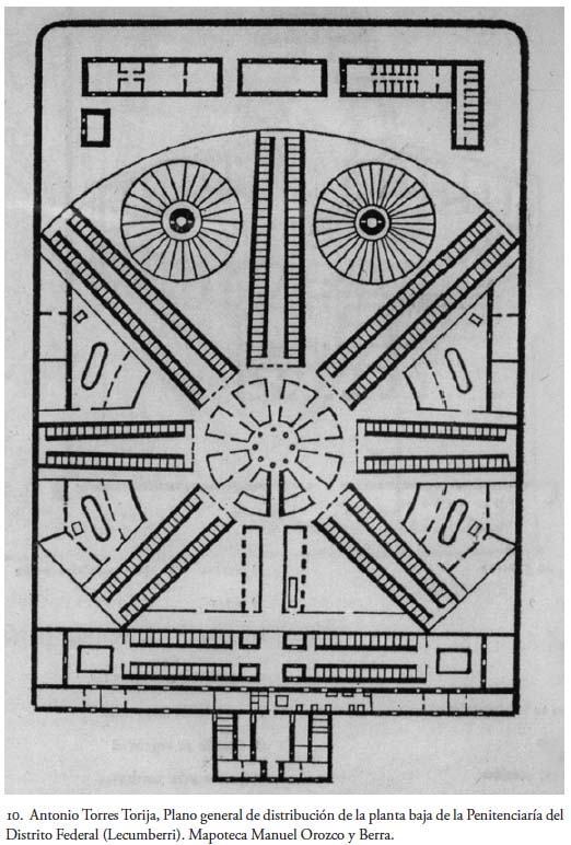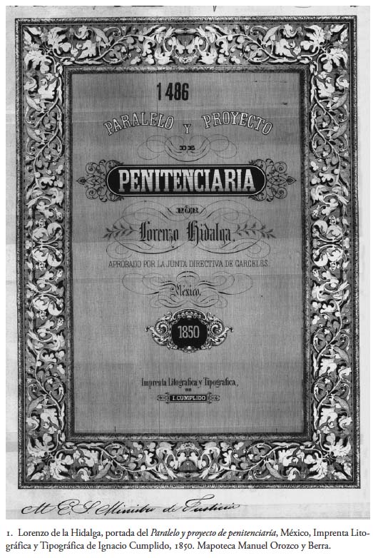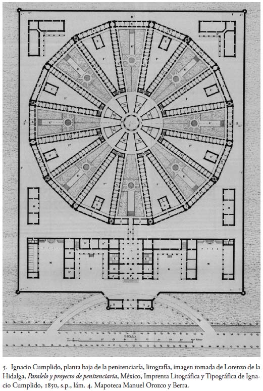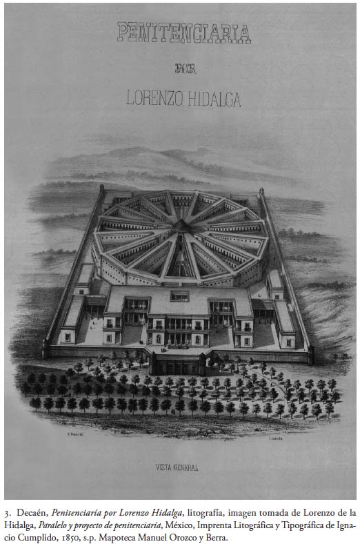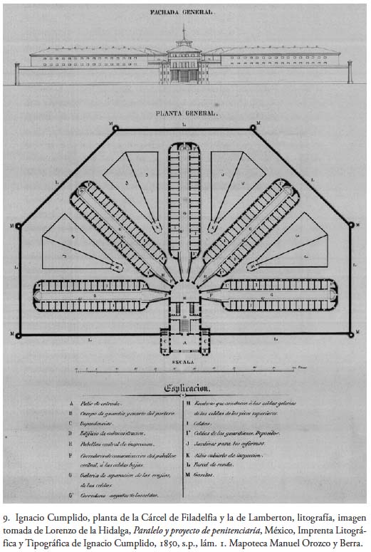 Años después descubrí, en la Mapoteca Manuel Orozco y Berra,2 el texto íntegro de Lorenzo de la Hidalga editado por la imprenta litográfica y tipográfica de Ignacio Cumplido con el título Paralelo y proyecto de penitenciaría por Lorenzo de la Hidalga. Aprobado por la Junta de Cárceles, México 1850, escrito y preciosamente ilustrado con los dibujos elaborados por el arquitecto mismo. Hoy, el Palacio de Lecumberri, donde se encuentra el Archivo General de la Nación, pasa a ser de nuevo un tema de interés, ya que se pretende trasladar ese repositorio a algún otro espacio, y considero importante devolver a la luz lo ideado por De la Hidalga, con los dibujos casi desconocidos que preparó para ilustrar su texto y que fueron litografiados por Casimiro Castro, Ignacio Cumplido y E. Riviere, y en empresas litográficas importantes como la de Decaén, ya que de alguna manera se advierte cierta influencia del arquitecto español en el Palacio de Lecumberri, diseñado en 1896 por Antonio Torres Torija, de acuerdo con el acomodo panóptico.