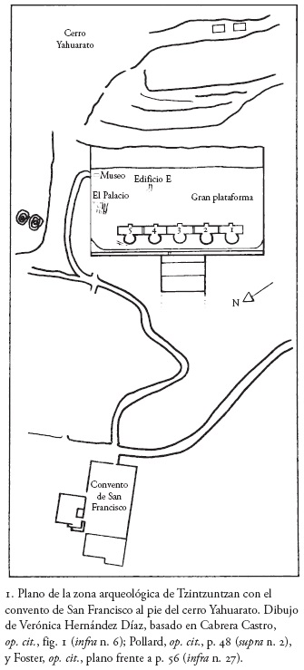 34 De acuerdo con Helen Perlstein Pollard, es probable que ocupara la plataforma donde habría estado la residencia de Zinzicha Tangaxoan, el soberano tarasco, en el sector poniente de la localidad en el actual barrio de Santa Ana, fuera del centro ceremonial (op. cit., p. 38). Respecto a los años de 1940, se informa que sólo quedaba una pila de rocas y una cruz de madera; véase Foster, op. cit., p. 272).