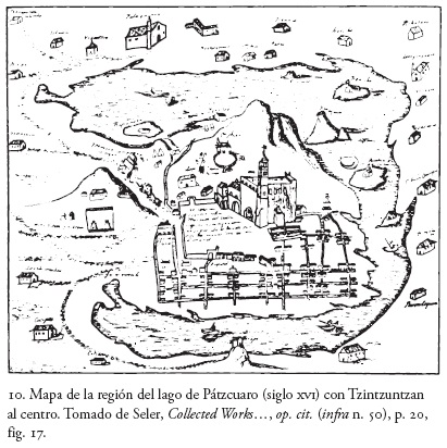 El mapa de tinta negra fue hallado por Eduard Seler en México a finales del siglo XIX.50 El segundo, al igual que otras nueve escenas históricas, se publicó en la edición de 1932 de la Crónica de Michoacán del franciscano fray Pablo de la Purísima Concepción Beaumont;51 debe hacerse notar que esas ilustraciones son copias, hechas hacia 1792,52 de la que hizo Beaumont por lo menos 14 años antes53 de la "pintura antigua en pergamino que conserva un indio [de Tzintzuntzan] llamado Cuini, descendiente de los nobles o primeros caciques de aquella corte".54 La conjunción de las nueve escenas históricas y del mapa del lago de Pátzcuaro copiados por Beaumont ha sido denominada por Roskamp "Códice de Tzintzuntzan".55 Con gran acierto, este autor ha estudiado esos documentos como una unidad y considera que podrían haber formado parte del alegato sobre la información y probanza de la ciudad de Tzintzuntzan registrada en 156756 (referida arriba).