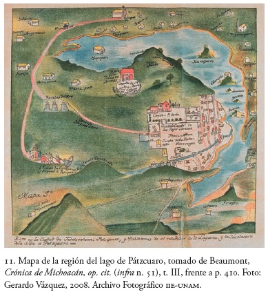 54 Beaumont, op. cit., vol. II, p. 25. La copia, en varias secciones, que hizo Beaumont de esta pintura ha desaparecido, a excepción de una escena que se encuentra en la Biblioteca John Carter Brown, de la Universidad Brown, Providence, Rhode Island. Esta imagen se reprodujo en la portada y en el interior del libro de J. Benedict Warren, Estudios sobre el Michoacán colonial. En esta obra no hay referencia alguna a la autoría original de Beaumont de esta pintura. De modo previo, Glass y Robertson (op. cit., p. 94) mencionaron escuetamente que parte del manuscrito del cronista estaba en dicha biblioteca.