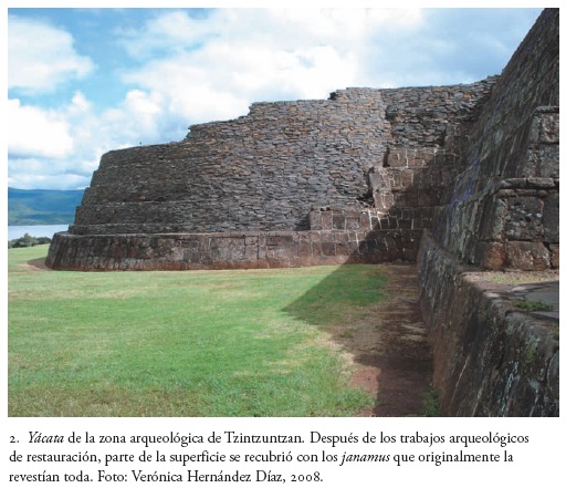 De acuerdo con las evidencias arqueológicas, puede decirse que una característica de la arquitectura tarasca es que las pirámides estaban totalmente revestidas de janamus: lajas de piedra basáltica o volcánica, de forma cuadrangular y principalmente rectangular, y de superficie pulida (fig. 2).9 Sólo una parte de los janamus muestra diseños grabados o en bajorrelieve.