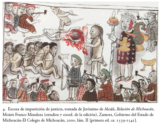La Relación permite adentrarnos en el complejo sistema religioso tarasco y el papel especializado de los participantes. En esta liturgia, en la que actos, objetos y materiales estaban del todo preestablecidos, llama poderosamente la atención la omnipresencia de humo, aromas y sonidos musicales como medios para establecer contacto con lo divino y ofrendar. Sobre todo, destaca el humo; el encendido de leña para producir humaredas constituía un ritual por sí mismo y se efectuaba de modo casi permanente, salvo cuando moría el señor de la casa.17 La población entera, e incluso el mismo irecha, cuando era recién nombrado en ese cargo, tenía la encomienda de recolectar leña, que se apilaba en el "patio grande de los cues"; en tanto, el sacerdote mayor o petamuti "estaba diputado sobre la leña de los fogones del dios del fuego" y los individuos comunes estaban obligados a tributarla, pues si dejaban de hacerlo cuatro veces se les encarcelaba.18 Además de las humaredas, en distintos rituales se acostumbraba hacer arder resinas olorosas como se apunta en el pasaje anterior, fumar tabaco y tocar instrumentos de viento, como flautas o cornetas y caracoles. En particular el acto de fumar se vincula con una escena de impartición de justicia, por medio del castigo y la ejecución, encabezada por el sacerdote mayor, en la que varios señores principales tienen pipas en la boca (fig. 4).