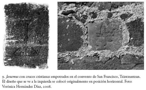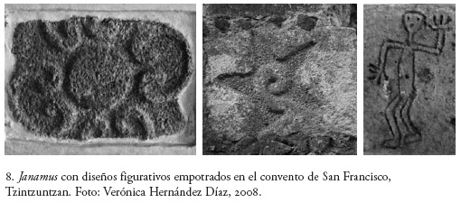 En otros casos se reconoce cierta intencionalidad particular, pero no es oportuno extenderse en ellos aquí, donde se atenderán algunas circunstancias históricas surgidas después de la Conquista en Tzintzuntzan, que en general pudieron promover la integración de los janamus decorados en el convento.