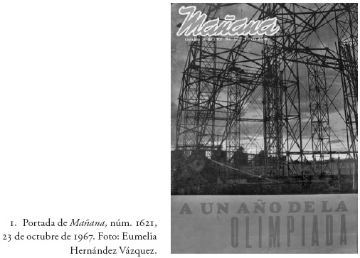 En contraste con un cielo poblado de nubes se encuentra la estructura de un edificio en construcción (fig. 1). Sin tener claro de qué tipo de estructura se trata, menos aún su función, intuimos un objeto arquitectónico de grandes dimensiones cuya extensión rebasa los límites del rectángulo fotográfico. Esta imagen de un proceso, publicada como portada de la revista Mañana en octubre de 1967, tiende, más allá de generar un conocimiento cierto sobre un hecho constructivo específico, a plantear un momento de expectativa. El momento es en buena medida parte del impulso propio de la publicación, sobre todo cuando ésta se ha autodenominado Mañana: "La expectación como método [...], incluso como iconografía, como publicación, no trata, pues, más que de poner secretos al día. Es la esperanza, instrumentalizada, de un sacar a la luz el secreto".1 Así, esta imagen se perfila dentro del contexto de la revelación y la promesa, cumpliendo con ello su función en el espacio público. Inasible en el instante de verla únicamente como portada, hace falta entrar en el contenido de la publicación para saber que esta complicada estructura pertenece al Palacio de los Deportes, quizá la obra arquitectónica más destacada de la XIX Olimpiada. Depositadas en la arquitectura, las expectativas de lo que México podría alcanzar para la Olimpiada fue el tema de Mañana a un año del gran evento. Intitulado "México cumplirá con decoro", el artículo principal de la revista consiste en documentar la visita del entonces presidente Gustavo Díaz Ordaz a las instalaciones deportivas. La gira del mandatario por los edificios abarcó cinco sedes: Palacio de los Deportes, Alberca Olímpica, Estadio de Ciudad Universitaria, Villa Olímpica y Canal de Cuemanco. Acompañado de embajadores de diversos países que querían atestiguar la viabilidad de los espacios deportivos en México, Díaz Ordaz legitimaba la arquitectura para la Olimpiada antes de que ésta entrara en función. Incluido el propio gobernante, las obras dejaron satisfecho a más de un actor político. Semion T. Bazarov, embajador de la Unión de Repúblicas Socialistas Soviéticas, expresó lo siguiente: "Lo que hemos visto terminado y lo que está aún en construcción son muestra del espíritu progresista de los mexicanos".2 En términos de publicaciones de arquitectura, la revista francesa L 'Architecture d'Aujourd'hui se encargaría, un año después, de patentar en el ámbito internacional las palabras del embajador de la Unión de Repúblicas Socialistas Soviéticas. En el número 140 de dicha publicación, dedicado a la arquitectura de los países del llamado Tercer Mundo,3 México no aparece en el listado de países cuya arquitectura deba considerarse perteneciente a una economía tercermundista y periférica; por el contrario, su inclusión en este número se debe a la originalidad y vanguardia que representan los proyectos arquitectónicos realizados ex profeso para la Olimpiada. En octubre de 1968 todo parecía indicar que estaba cubierta la esperanza. El mañana había llegado.