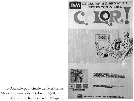 En 1941, el grupo García Valseca puso en circulación Esto, el primer diario deportivo.44 En octubre de 1968, el diario precursor en los deportes publicó en sus páginas un anuncio publicitario de Telesistema Mexicano (TSM)45 relativo a la venta de televisores a color (fig. 10). La imagen principal de esta publicidad la compone la ilustración de una familia nuclear que observa el televisor, en cuya pantalla se dibujan los cinco aros olímpicos. No cabe duda de que en el relevante sistema de objetos que despertó la Olimpiada, la televisión a color era uno de los más preciados. La distinción social que suponía adquirirla se ligaba a la novedad de observar los hechos en un panorama colorido. Si bien se definió como el medio por excelencia al que aspiraba la clase media mexicana, es evidente que la televisión a color llevó a cabo la transformación de un lenguaje visual. Así, el cambio que presenció la imagen en general después de 196846 mucho debe a la impronta de este medio de información y su conversión en emisor de imágenes a color. Como hemos podido advertir a lo largo de este texto, la cultura de la imagen en 1968 se hace más extensiva de lo común, tanto en el número de reproducciones como en sus canales de distribución, y, en este caso, la televisión a color es un medio que predomina sobre los demás. Estamos ya ante una cultura de la mirada mediática que observa y absorbe una infinidad de imágenes nuevas, como si antes de que ocurriera la transformación cromática se representara en ellas otra cosa.
