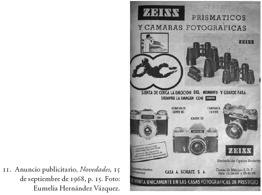 La arquitectura moderna, forjada según la idea de "máquina para habitar", se había transformado gracias a los medios en una "máquina para observar". No cabe duda de que en 1968 el programa arquitectónico comprendió su conversión en programa televisivo. Ligadas a la campaña publicitaria, las representaciones mediáticas de los edificios generaron la noción del espectáculo. En tanto que la cultura visual daba pruebas de su estado de exaltación, no se debía perder de vista ningún momento. La arquitectura, entendida en su función como escenario, era registrada a cada instante por una mirada que producía y propagaba un amplio panorama de imágenes. Para ello, se contaba con toda una variedad de cámaras televisivas, cinematográficas y fotográficas (fig. 11). El lente de las cámaras era el principal receptor de información para fabricar imágenes dentro de la fascinante tónica del espectáculo. Una arquitectura atractiva que fluctúa entre los cauces del espectáculo y la publicidad fue construida visualmente por un sinnúmero de artefactos. En su impresionante novedad formal reside la noción de simulacro y propaganda, capaz de crear un espacio cuya función consiste en generar una ficción. Tal parece que la arquitectura, vista desde la perspectiva televisiva, y más tratándose de un evento mediático a gran escala, invita a pensar en una idealización, en un poder de ensoñación que produce el hecho arquitectónico.