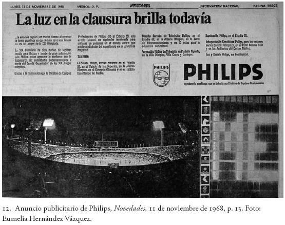 Un factor importante en la construcción de las imágenes televisivas en color fue el elevado nivel de iluminación.52 Siguiendo una imagen publicitaria de focos Philips, parece que esta empresa auspició la clausura del evento deportivo en el Estadio Olímpico (fig. 12). Con el encabezado "La luz de la clausura brilla todavía", esta publicidad de Philips es muestra, además de la tarea lumínica emprendida en la Olimpiada, de la correlación entre la arquitectura y los productos comerciales de la época. Unificado el espacio arquitectónico con la mercancía e inscrito éste en la carrera publicitaria de México 68, es posible asignarle la categoría de objeto de consumo. De hecho, todas las edificaciones olímpicas parecieron convertirse automáticamente en marcas registradas y las mercancías corrientes de la época se relacionaron con esas monumentales construcciones. Por sus vínculos con productos del mercado y por su presencia en un medio como la televisión, la arquitectura fue consumida por todo aquel que la observó: "En la era de los medios de comunicación de masas el cliente no es simplemente quien paga el edificio o quien vive en él. El cliente es también el crítico, el periodista, el vecino, el lector, el político; en una palabra, el público en sentido amplio".53 Por tanto, el consumo del espectáculo arquitectónico se desencadenó masivamente, lo cual nos lleva a pensar en su magnífica imagen como dispositivo transmisor de capitales simbólicos. Parte fundamental de la fábrica de imágenes echada a andar en 1968 era justamente la transmisión de dichos capitales, que ofrecía al por mayor en los mecanismos de construcción visual. ¿Qué mejor ejemplo para ofrecerlos que el referente visual concreto que presenta la arquitectura? No obstante, debemos tener en cuenta que todo producto de consumo tiene su límite, pues su papel de agente en cuanto transmisor del capital simbólico tiene una fecha de caducidad. En la era de masas y la industria cultural, la arquitectura tiene un valor de cambio fluctuante.54 Luego de la festividad olímpica, las luces y las cámaras puestas sobre los edificios se apagaron. Pese a la persistencia de frases como "La luz de la clausura brilla todavía", su fascinante imagen fue despojada de sus principales autores: los medios.