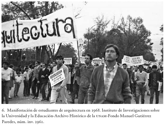 Calificadas por el arquitecto Pedro Ramírez Vázquez como "inquietudes juveniles",21 las movilizaciones de los universitarios contaron con la presencia de jóvenes arquitectos, la mayoría de ellos pertenecientes a la Escuela Nacional de Arquitectura (fig. 6). Puede observarse en la imagen la presencia de estudiantes de arquitectura que se identificaban a través de su escuela durante manifestaciones en las calles. Es muy probable que los manifestantes presentes en la fotografía hayan pertenecido al llamado Comité de Lucha de Arquitectura. Éste tenía el fin, como muchos de los grupos que conformaron el Movimiento Estudiantil de 1968, de cambiar las estructuras en que se cimentaba el país.22 Siguiendo el pensamiento del filósofo Herbert Marcuse, Alberto González Pozo, un joven arquitecto en ese entonces, escribía acerca de las contradicciones de la tecnología y de su impacto en la arquitectura.23 Pero, más allá de poner de relieve las dicotomías presentes en el sistema de capitales y sus vínculos con el arte de la construcción, tendemos a pensar que si hubo un cambio generado en el ámbito arquitectónico surgió en las aulas, en el renglón de la enseñanza. En un artículo intitulado "Revolución estudiantil. El caso de la Escuela Nacional de Arquitectura", el arquitecto en formación Jorge Rodrigo Peña hacía patente la demanda de integrar el conocimiento teórico a la práctica.24 Desde nuestro punto de vista, conforme a las tendencias ideológicas de la época, se pretendía relacionar el saber arquitectónico con las posibilidades de la arquitectura para atender las necesidades fácticas de la sociedad. Si bien la labor del arquitecto se entiende comúnmente desde su incidencia en su contexto social, en 1968 esta idea se acentuó. Más adelante, en su artículo, Jorge Rodrigo Peña diría lo siguiente: "Tal vez aún sea difícil realizar lo que los estudiantes de arquitectura a través de su vanguardia ven como una posibilidad; pero el mismo hecho de luchar por ello ya está modificando la historia y esencia de las escuelas, de la Universidad, del sistema educativo mexicano".25 Se manifiesta, en las palabras del estudiante, la noción del arquitecto como ingeniero social que puede impulsar reformas sociales ya no sólo por medio de su deber constructivo, sino también desde el ámbito de la educación. En síntesis, el texto de Peña da cuenta de la conciencia imperante respecto al futuro educativo de México y a su importancia, tema muchas veces ajeno a los debates arquitectónicos. A nuestro parecer, bien valdría la pena dedicar un estudio in extenso a la enseñanza de la arquitectura posterior a 1968.