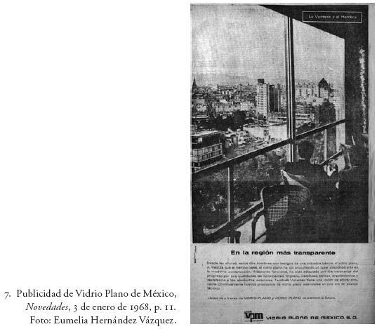 Una década después de haberse publicado la novela de Fuentes, el título aparece en un anuncio publicitario ligado a la arquitectura (fig. 7). El 3 de enero de 1968, el periódico Novedades tiene dentro de sus páginas la imagen promocional de Vidrio Plano de México, corporación dedicada a comercializar grandes ventanales de vidrio bajo la divisa que repite el epígrafe de Reyes y el título de la obra de Fuentes. La fotografía que acompaña su construcción mercadológica es cercana a la visión de Anáhuac en el siglo XX. Sentados de espaldas a la cámara, dos hombres observan, a través de una gran cortina de vidrio, la extensión citadina.32 Es el valle de Anáhuac asfaltado, estructurado a partir de proyectos arquitectónicos y urbanos modernistas. La imagen nos introduce a la ciudad, teniendo como antecedente a los hombres que observan a través del filtro del cristal. El amplio ventanal es a su vez el elemento que proporciona amplitud de campo a la imagen, y a la retícula formada por éste le corresponden las de los edificios modernos. Esta composición, donde conviven armónicamente el hombre, la industria constructiva y la amplitud del cielo, parece sostener una de las ideas que fluctúan en la novela de Fuentes: "México es un país vital".33 La conceptualización del anuncio publicitario responde bien a esta idea y no cabe duda de que los mercadólogos de la época conocían bien las estrategias visuales y sus vínculos con la palabra escrita. Tan es así que la imagen resulta también un estímulo para problematizar un tema, acaso un mito, de la arquitectura moderna: la transparencia.
