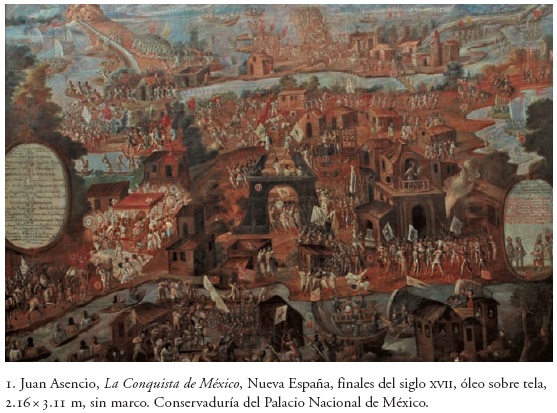 El óleo de la Conquista de 2.16 x 3.11 m se encontró en muy malas condiciones en las bodegas del Palacio Nacional. Las restauradoras Laura Flores y Ruth Harquín realizaron la limpieza, desmontaje, reentelado, resane y un importante trabajo de reintegración en amplias zonas antes dañadas. La soltura de la pincelada recuerda aunque muy lejos de su calidad la de Cristóbal de Villalpando e induce a ubicar la obra a finales del siglo XVII novohispano. Este periodo parece ser ratificado por una firma con data en la zona central, pintada en color blanco, sobre el borde frontal del templo central de Tenochtitlán, que reza: "En Mexico por Juan Asencio [...ne] 1683".