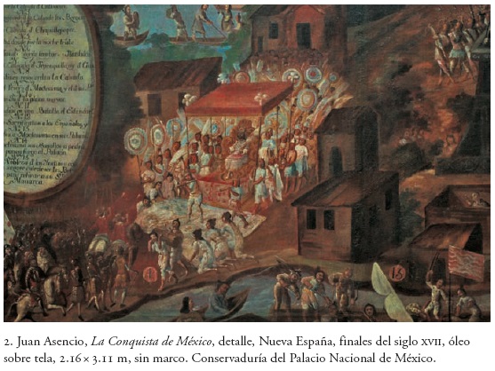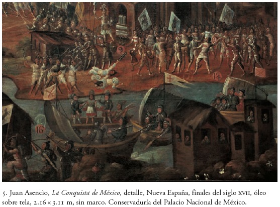 La tierra firme, en el óleo comentado, está prácticamente envuelta por agua por los cuatro lados. También en el centro del territorio, como en los mapas mencionados, esta pintura nos muestra como lugar que organiza el espacio circundante a la imagen del templo. La manera en que se figuró el templo nos recuerda mucho el biombo del Museo de Historia de Chapultepec, obra quizá anterior a la que aquí presentamos. Debe agregarse que, en el biombo del Museo del Castillo de Chapultepec, el templo no ocupa la parte central de la representación y que, de hecho, los episodios, en ambos trabajos, siguen un ordenamiento en el espacio muy distinto. En este óleo de la Conquista tendríamos, por lo tanto, una idea de Tenochtitlán, a la vez geográfica e histórica: la tierra mexicana se compone no sólo de tierra y lagos, sino también de conflictos y batallas. A su vez, la trabazón sangrienta entre dos razas teje simbólicamente el territorio material.