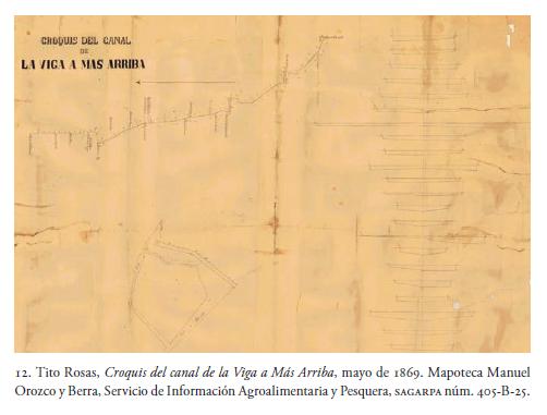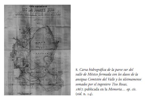 En esta publicación está anexado un interesante plano de desagüe hecho como parte de la valoración que el ministro de aquel año, Blas Balcárcel, solicitó a los ingenieros con el objetivo de recobrar la cotidianidad acuática de la ciudad y las zonas aledañas; y es que lo que motivó al funcionario a pedir tal estudio fueron las constantes y fundadas quejas de los transportistas y de los pasajeros, así como el perjuicio de la misma capital que se veía abastecida tardíamente de los productos provenientes de las áreas sureñas de la cuenca. Uno de los diagnósticos que se llevaron a cabo dejó constancia en la Carta hidrográfica de la parte sur del valle de México formada con los datos de la antigua Comisión del Valle y los últimamente tomados por el ingeniero Tito Rosas 14 de 1867 (fig. 8).