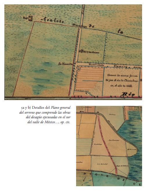 La caja de agua posiblemente es obra algo posterior al dique de Culhuacán, proyectada por temor a una temporada de copiosas lluvias en lo sucesivo y pensada una vez que se cumplió el primer objetivo de formar vasos artificiales al sur del dique. También se observan delgadas líneas rojas y azules diseminadas en varios puntos del territorio, que corresponden a otras vertientes hidráulicas no naturales y de menor importancia. Las líneas en rojo se diferencian porque pueden ser las extensiones proyectadas o últimas adhesiones a las ya existentes, por ejemplo, el acalote de la hacienda de los Portales; en esta área, que se detalla en la figura 5a, se colocan referencias constructivas como una troje o la capilla de las Ánimas y La Hermita (sic), contiguas al camino a México (que corresponde a la actual calzada de Tlalpan). Obsérvese también la descripción del terreno, como el banco de arena formado por el río Churubusco que está flanqueado por tierras de cultivo.