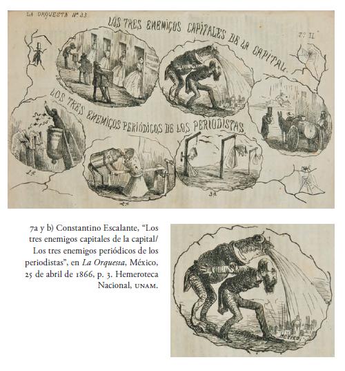 El 25 de abril de 1866, Constantino Escalante manifiesta algunos temores de los capitalinos y de los periodistas para aquel año, en la caricatura "Los tres enemigos capitales de la capital/Los tres enemigos periódicos de los periodistas", de la cual es interesante particularmente una viñeta que corresponde a la amenaza de una nueva inundación en la ciudad; en ella, vestido con levita, un monstruoso anfibio vomita con toda su fuerza sobre la empequeñecida capital, al tiempo que un descomunal funcionario-ingeniero intenta detener la embestida con poco éxito (figs. 7a y 7b).