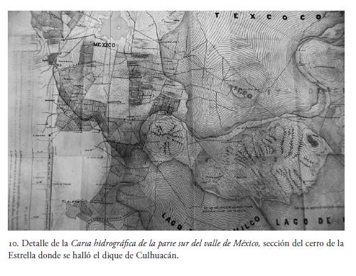 Junto a esta sección hay otro corte transversal de un antiguo albarradón (¿acaso el de San Lázaro?) del que no se detalla la ubicación. No es ocioso detenernos a observar la sección que un año antes representó Garay en su Plano general del terreno. Se ve la cercanía del lago de Xochimilco con el de Texcoco, en medio de los cuales se halla el cerro de la Estrella, y encontramos también la vertiente que rodeaba esa eminencia en su camino hacia el vaso de la cuenca. Si se observa más de cerca, se verá el dique de Culhuacán, que el ingeniero Rosas también detalla en su trabajo (fig. 10).