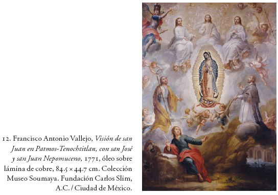 Una composición alegórica del pintor Francisco Antonio Vallejo es un excelente corolario a lo dicho hasta aquí (fig. 12). Es, bien vista, una declaración que honra al juramento de los tres patronos titulares y principales de la Nueva España: san José (patriarca de la Iglesia indiana y la conversión de los indios), la Virgen de Guadalupe (del reino, sus ciudades y villas) y san Juan Nepomuceno (de sus cabildos y más importantes corporaciones). Muestra, además, un escenario marítimo y celestial enmarcado en medio de la revelación que tuvo san Juan Evangelista en Patmos, según el capítulo 12 del Apocalipsis: contemplando la figura de la Mujer Águila encinta y huyendo hacia el desierto para escapar del acoso de la bestia infernal. Como se sabe, este pasaje lo interpretó desde mediados del siglo XVII el teólogo criollo Miguel Sánchez, como una prefigura de las apariciones guadalupanas del Tepeyac en el valle de México. Por eso, aquí se mira "intervenido" el atributo principal de san Juan como escritor visionario, con pluma en mano: hay que notar que el águila no sólo es el tradicional símbolo que le corresponde en el tetramorfos (que además sostiene en el pico el tintero para que el evangelista moje la pluma), sino que se confunde deliberadamente con el ave fundacional de Tenochtitlán y, por eso mismo, se ha colocado a la vera de su tunal originario.38 Este imaginario criollo estaba en consonancia con la decidida promoción que hacían los jesuitas de estos tres cultos y del papel protagónico que desempeñaron en las identidades locales. La obra de Vallejo sin duda se hace eco del "momento guadalupano", o cuando el papa Benedicto XIV declaró a la imagen del Tepeyac patrona principal de la Nueva España en 1754. Bien sabemos que esta gestión fue encabezada por los jesuitas en la figura del procurador Juan Francisco López, que viajó a Roma y se valió, para su buena fortuna, de las influencias en la corte del padre Francisco Rábago. Hay incluso una curiosa iconografía de "los tres juanes" (el Bautista, el Evangelista y el santo de Praga) reunidos como mártires y profetas, asociados no sólo por el nombre y su significativo papel revelado sino por su anclaje en los crecidos cultos locales y su reiterada liga con la visión guadalupana.39