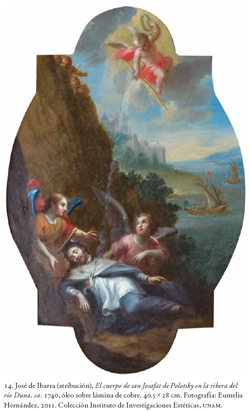 Si el Gonzaga era una imagen de asunto moral (paradigma de castidad y entrega para los estudiantes "en la guarda de la pureza"), los martirios sin duda guardaban connotaciones políticas. Aquella dupla de Nepomuceno y Josafat componía en verdad un argumento ejemplar y por demás pertinente: ambos fueron dignidades del clero secular en la Europa del Este, martirizados en defensa de la institucionalidad de la Iglesia ante el despotismo de los príncipes. En sus figuras había un eco de los afanes de la Compañía por colocarse como imprescindibles agentes entre los intereses del poder y la educación de la clase dirigente (no obstante pagaran con su vida el celo a su ministerio). En realidad, en este pendant anidaba un mensaje nada inocente para presidir las ceremonias y los certámenes escolares, que Clavijero encabezó allí en sus intentos de renovación educativa. Aunque las pinturas fueron desmanteladas por el positivismo de Gabino Barreda al triunfo de la República (otra manera de intolerancia ante un pasado irreconciliable), ahora puedo decir, con un buen grado de certeza, que afortunadamente ha quedado un testimonio visual de aquello que la iconoclasia liberal se encargó de borrar de la memoria. Se trata de las dos laminitas de cobre que hoy se custodian en la oficina del director del Instituto de Investigaciones Estéticas de la Universidad Nacional Autónoma de México, que no sólo son obras factiblemente atribuibles al pincel de José de Ibarra, sino que constituyen la primera idea o la traducción, como una suerte de bozzetini, de aquellas enormes pinturas murales ahora desaparecidas. Más allá de que coincida la descripción de Viera con las imágenes de estos santos ahogados y sufriendo el escarnio público, es un hecho incontestable la participación de Ibarra en este proyecto "total", de prestigio y novedad, que le mereció el aplauso público y luego el trato como pintor decano de su gremio. Un reconocimiento venido justo en el cenit de su carrera, que se pone de manifiesto en la misma calidad y exquisitez de estas dos laminitas mixtilíneas, hasta ahora sin paternidad. Bien vistas, están pensadas como composiciones de mayor aliento: la amplitud y profundidad del paisaje y las figuras centrales en primer plano revelan que se trata de "invenciones" para su traslado a un formato mayor y, no por acaso, con un punto de vista di sotto in su.