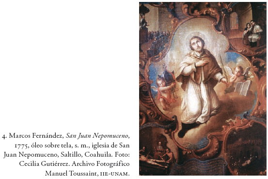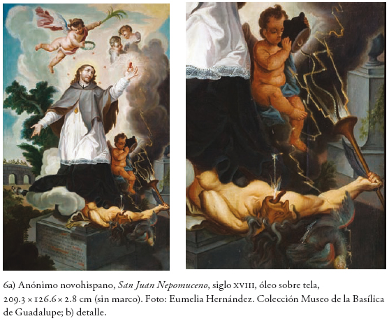 Luego de la abundante iconografía guadalupana y josefina del siglo XVIII, no hay otra más rica y diversa en el contexto novohispano que la del santo mártir, canónigo de Praga, ahogado por una turba de esbirros en el río Moldavia el 16 de mayo de 1383 (para otros, esto sucedió en realidad el 20 de marzo de 1393) (fig. 4). Todo por haberse resistido al despotismo y los caprichos del emperador Wenceslao de Bohemia, enfurecido por los celos y cuya esposa Juana, mujer piadosa, tenía en san Juan a su confesor de cabecera. En verdad se trata de un santo tardomedieval con perfiles más legendarios que reales y que, cumpliendo con su ministerio sacerdotal, se dice, padeció con estoicismo la tortura del tirano (precisamente por no revelar el secreto de confesión de su consorte). En realidad, se piensa que todo sucedió en medio de un conflicto de potestades entre la autoridad temporal y el arzobispado, alentado por el antipapa Clemente VII de Aviñón, quien buscaba aliados para legitimarse a cambio de favores y absoluciones otorgadas a pedido. Al cabo, pagando con su vida la guarda del silencio, san Juan quedó proclamado como emblema de una Iglesia perseguida y asediada por el poder temporal, ya durante el naciente siglo de la Ilustración; pero también en un argumento más para oponer a éste la supremacía del secreto eclesiástico o aquella misma razón de estado, para que los órganos y miembros del "estado eclesiástico" quedaran sustraídos de las leyes de los hombres o ajenos a la transitoriedad de sus regímenes políticos. Era obvio que así también quedaba encumbrada la figura del confesor real, mediante un envase martirial y por demás emblemático: Nepomuceno, reputado como doctor en cánones por la Universidad de Padua, jamás se retractó de su ministerio y así puso a salvaguarda la institucionalidad de su iglesia local y, sobre todo, los intereses del papa legítimo de Roma.