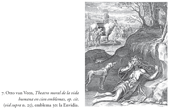 Se trata de una cuarteta de mal gusto pero que en verdad comparte con esta imagen alegórica una intencionalidad similar, o al menos concomitante, dada la presencia tan obvia del ave parlante y el ofidio, detenidos e inmunizados con el bonete nepomuciano (y por el ofidio aquí se estaría trasnominando al "poblano", ya que termina como "animal maldito" según la historia de la expulsión del Génesis). El "mono", tengo para mí, es quizá un mote para referirse a un engendro ("figura híbrida o deforme representada", según el diccionario), en este caso a la enjuta personificación de la Envidia y la Maledicencia, tradicionalmente figurada en una anciana jorobada y bizca, ya estéril (por eso los senos flácidos), de pensamientos truculentos y perversos (por eso la cabellera de serpientes), de dientes podridos y aliento herrumbroso (porque su verbo es un vómito de sus propias vísceras), que se revuelca entre fuegos al saberse derrotada, tal como se figuraban los herejes enemigos de la Iglesia en el discurso de los carros triunfales contrarreformistas. En su Theatro moral de la vida humana en cien emblemas, el emblemista neoestoico Otto van Veen representaba a la Envidia tirada en un erial con su cabellera de serpientes, arrancándose una de ellas con un ademán de furia y rencor, para arrojarla sobre sus antagonistas (símbolo de "sus pensamientos mortíferos") (fig. 7). También se le mira al lado de su inseparable mascota, el perro sabueso y ladrador, que la acompaña a todas partes como emisario y mandadero, ya que a menudo riñe con otro perro en pos del mismo hueso (que son los honores y cargos venidos del poder). En su declaración a esta figura, el sabio maestro de Rubens advierte, emulando en esto al emblema 71 de Andrea Alciato: "Este solo vicio carece de algún deleite; este solo trae consigo el castigo de sí mismo; se revuelca y se emponzoña con su mismo veneno; todo es ira, todo furor, todo es rabia, hasta comerse su mismo corazón".25