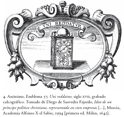 A la par, conviene recordar que algunos asuntos u objetos correspondientes a la ciencia fueron de utilidad en el campo de la emblemática. En este sentido, existe una sugerente relación entre la figura del reloj sobre la mesa con el emblema 57 Uni reddatur (Sea atribuido a uno) que el jurista Diego de Saavedra Fajardo (1584-1648) concibió para el libro Idea de un príncipe político cristiano, representada en cien empresas [...]. Tanto en la imagen en la primera edición de 1642, como en la valenciana de 1660 y la madrileña de 1675, se observa un reloj con forma de tabernáculo encima de una mesa, con campana en la cima, dos esferas al frente y con engranajes en un cuadrante lateral (fig. 4). La forma del reloj posee alguna similitud con la del del lienzo de Rodríguez Juárez, pero más allá, la conexión radicaría en el contenido, pues se sostiene que al actuar como la maquinaria de dicho aparato, las manos del gobernante marcan el devenir de sus súbditos, así como las pautas a sus consejeros, quienes sólo le deben asistir en sus tareas pues es él quien ordena y ostenta autoridad absoluta, idea que se ajustaba a un sistema que veía en la figura del monarca a quien encabezaba el cuerpo político.