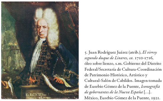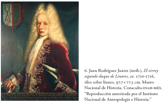 Dentro del repertorio pictórico novohispano sobresale el retrato conmemorativo que Juan Rodríguez Juárez (1675-1728) hizo de don Fernando de Alencastre Noroña y Silva, segundo duque de Linares, marqués de Valdefuentes y de Govea, conde de Portoalegre (1661-1717), quien fungió como virrey de la Nueva España entre 1710 y 1716. Sin duda, retratar a un personaje de su rango se encomendó a uno de los principales pinceles de la ciudad de México en la segunda década del siglo XVIII: Juan Rodríguez Juárez, quien a la par de haber sido reconocido como pintor de temas religiosos se desenvolvió con soltura dentro del género del retrato, conforme lo muestran las cualidades plásticas del lienzo del que parten las reflexiones de este ensayo.