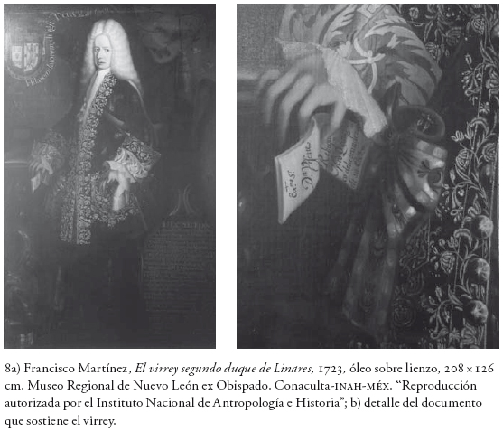 Sumada al óleo que ha servido como hilo conductor de este estudio, hay una segunda imagen del duque de Linares en tamaño natural. Ésta forma parte del acervo del Museo Franz Mayer62 y resulta de interés, entre otras razones, por tener escrita en el documento que el virrey sostiene con la mano la inscripción: "Juan Rodriguez Xuarez pintor de la grandesa de V[uestra] Ex[celenci]a" (fig. 7a y b). Resulta sugerente pensar que este lienzo proceda de un convento de religiosas carmelitas dado que en 1836, en una nota impresa en Los tres siglos de México durante el gobierno español, hasta la entrada del Ejército Trigarante [...], se informó: "El retrato de cuerpo entero del duque de Linares se halla en la portería de Santa Teresa la Nueva, pues fue su bienhechor".63 El dato permite saber que la comunidad tenía una obra para recordar su persona, pues según dio noticia fray Andrés de San Miguel el virrey enviaba alimento a las monjas, las cuidó de vestir, arregló su coro, determinó que tras su muerte se les otorgaran dos mil pesos, y les mostró su particular estimación al ceder "todas las alhajas" las obras de plata y el dosel de su oratorio, mercedes que sin duda merecían el reconocimiento a su generosidad.64