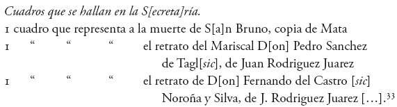 32. "Lista de cuadros de pinturas que por orden de S[u] M[ajestad] va llebando el Sr. Santiago Rebull para Palacio". México, 29 de mayo de 1866. AASC, gaveta 38, exp. 6505, doc. 2, sin foliatura. Apud ibidem, p. 321.