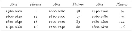Llegaron además maestros y oficiales de otras partes del virreinato vinculadas, por razones naturales y comerciales, con Puebla de los Ángeles, encrucijada de las rutas coloniales, como Oaxaca y Guatemala, Veracruz y los puertos del Caribe (La Habana, Puerto Rico y Santo Domingo) e incluso de centros más lejanos como Zacatecas. Durante el siglo XVII su número aumenta constantemente y desde el último tercio de esa centuria se convierten, después de tejedores y sastres, en el oficio más común junto con zapateros, loceros, albañiles o carpinteros, muy por encima de pintores, escultores, entalladores y ensambladores, superando con holgura en las dos últimas décadas del siglo XVIII el centenar. Entre 1580 y 1820 hemos registrado, hasta el momento, a 669 plateros,4 cifra extraordinaria que da la verdadera medida de lo que el arte de la platería significó en el desarrollo y el florecimiento de Puebla de los Ángeles. Su gran mayoría (474) ejerció su actividad a lo largo del siglo XVIII, periodo en que Puebla llegó a contar con más artífices que los censados en la propia corte madrileña (404).5