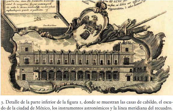 El original también muestra en la parte baja del recuadro la frase "Línea meridiana" y cómo se trazó, información que ya no aparece en la copia. Por último, respecto del grabado original, es apropiado comentar que sobre la orla en torno a las casas de cabildo aparecen en clara alegoría al tema tratado, pues se dibujaron símbolos entonces asociados con el quehacer astronómico el compás, la parte posterior de dos telescopios, parte de un cuadrante,23 una figura geométrica, así como un par de documentos enrollados.