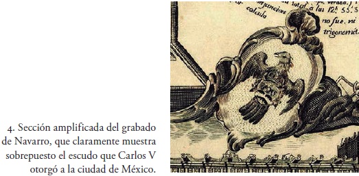 Seguramente Alzate y Bartolache la incluyeron para indicar el lugar desde donde realizaron las observaciones y como reconocimiento al mandato que recibieron de las autoridades capitalinas. Como ya se ha dicho, esa parte del documento tiene en la zona central superior la representación de un águila de frente con las alas abiertas parcialmente, sobre la cual se dibujó de manera simplificada el escudo que Carlos V le otorgó a la ciudad de México el 4 de julio de 1523.29 En la figura 4, sobre el pecho del águila se mira la torre que representa a México-Tenochtitlan, flanqueada por los dos leones rampantes que clavan sus garras sobre ella, simbolizando la toma y posesión de la capital azteca por los españoles, lo cual se indica además por la presencia de la corona. Aunque el escudo ilustrado en el documento, grabado por Navarro, no se adoptó oficialmente para la ciudad de México en 1534, sin duda cumplía con la intención de señalar con claridad que aquellas observaciones se hicieron en la capital de la Nueva España. Aquí es pertinente indicar que durante el siglo XVII otros documentos llevaron representaciones similares, como por ejemplo el escudo situado en el margen superior derecho del Plano de la ciudad de México dividida en cuarteles de Manuel Villavicencio, publicado en 1782.