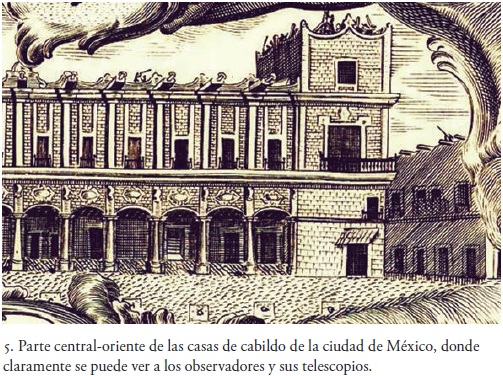 Finalmente, la figura 5, que amplía la parte central de las casas de cabildo y la torre oriente de las mismas, muestra con claridad a los observadores del tránsito. Se puede apreciar entre el centro de ese edificio y aquella torre la presencia de un par de observadores, uno de los cuales asiste al otro, que mira a través del telescopio. Sobre el torreón, un grupo nutrido observa por al menos cinco telescopios, mientras que al otro lado de la calle21 puede verse a otro observador solitario apuntando con su telescopio hacia el cielo. Todos estos detalles han desaparecido en la copia publicada en Puebla.