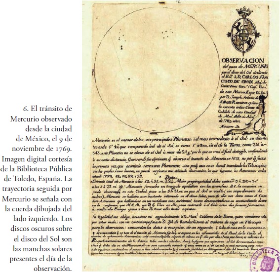 El 9 de noviembre del mismo año (1769) ocurrió otro tránsito, pero en esa ocasión el planeta que cruzó frente al disco solar fue Mercurio. Alzate observó también ese suceso astronómico y volvió a publicar los resultados en una hoja suelta, ilustrada en la figura 6.