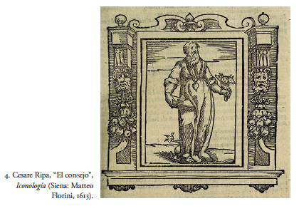 Santiago Sebastián apunta como fuentes conceptuales del emblema CXLIV de Alciato sentencias bíblicas y humanísticas, como algunas que aparecen en el Éxodo (23, 8), en el Deuteronomio (16, 19), en el Criticón de Gracián (II, 82) y en los Adagia de Erasmo (III, 913). En este sentido, conviene recordar también la descripción de Cesare Ripa sobre la alegoría del Consejo, pues aunque la Iconología no se edita hasta 1593, sus comentarios son herederos de la literatura, del arte y de la numismática de la Antigüedad y, por tanto, esta obra es receptora de imágenes culturales que provienen de siglos atrás, como sucede con el propio libro de Alciato. Pues bien, respecto al consejo, Ripa lo describe como "anciano revestido con largos ropajes de color rojo", tal como vemos precisamente a los senadores en la pintura de Lima. No obstante, en Ripa porta diversos atributos que en la pintura no aparecen: un collar con corazón, un libro cerrado y una lechuza, tres cabezas, de perro, lobo y león, una cabeza de oso y un delfín (fig. 4). Y cita la Ética y la Retórica de Aristóteles, a san Ambrosio, Homero, Plutarco y Ovidio. Respecto a la vestidura talar de color rojo, indica que