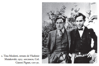 Al contrario de lo que se mencionaba en la prensa norteamericana, la relación de la embajada con los comunistas locales fue más bien fría. Alexandra Kollontai analizó profundamente la situación del Partido Comunista Mexicano que, nacido en 1919 bajo el amparo de la III Internacional Comunista, seguía aún en la lucha por la consolidación de su estructura debido, en parte, a que "los antecedentes anarcosindicalistas de algunos de sus militantes impidieron su desarrollo y lo imposibilitaron para enfrentarse a los problemas políticos nacionales",20 expresaba así que el militante mexicano no poseía todas las características de un revolucionario. En su juicio, el partido y sus miembros eran "poco numerosos, careciendo de líderes preparados, no está en condiciones de dirigir los acontecimientos e influir en su curso; va a la zaga de los sucesos",21 había entre ellos una heterogeneidad y una falta de hábito, de disciplina, que hacía difícil la labor de consolidación. Debido a esto sólo mantuvo relación con algunos de los camaradas con los que en verdad entabló una amistad. La presencia de Tina Modotti en el partido y en la embajada soviética se dio desde el primer momento al estar imbuida en el círculo artístico-intelectual mexicano.22 Estuvo presente en 1925 cuando el poeta ruso Vladimir Maiakovski (fig. 2), en su travesía hacia los Estados Unidos, hizo una parada en México y también en las reuniones que se llevaron a cabo en la embajada durante el periodo de Kollontai. La embajadora, a pesar de sus achaques cardiacos, era una mujer de gran vitalidad y fuerza, sus mensajes eran claros y precisos; su creencia en el bolchevismo y Stalin, inquebrantable y su dedicación a la causa, firme. Para Tina fue una figura de gran admiración desde el primer momento.23 Estaba al tanto de sus publicaciones en pos de la emancipación femenina y concordaba con los preceptos ideológicos de la profesionalización e independencia de la mujer. De ella interiorizó que "el trabajo en el partido, la agitación entre las masas, escribir artículos, folletos, etc., [es] una labor vital. [Es] lo que enriquece el espíritu. Además [de ser lo que] el partido necesita ahora".24